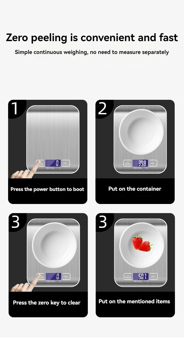 • Versatile Use :Whether you're weighing food, fruit, snacks, or baking tools, this kitchen scale is versatile enough to handle all your measuring needs. It's a must-have tool for every home cook.