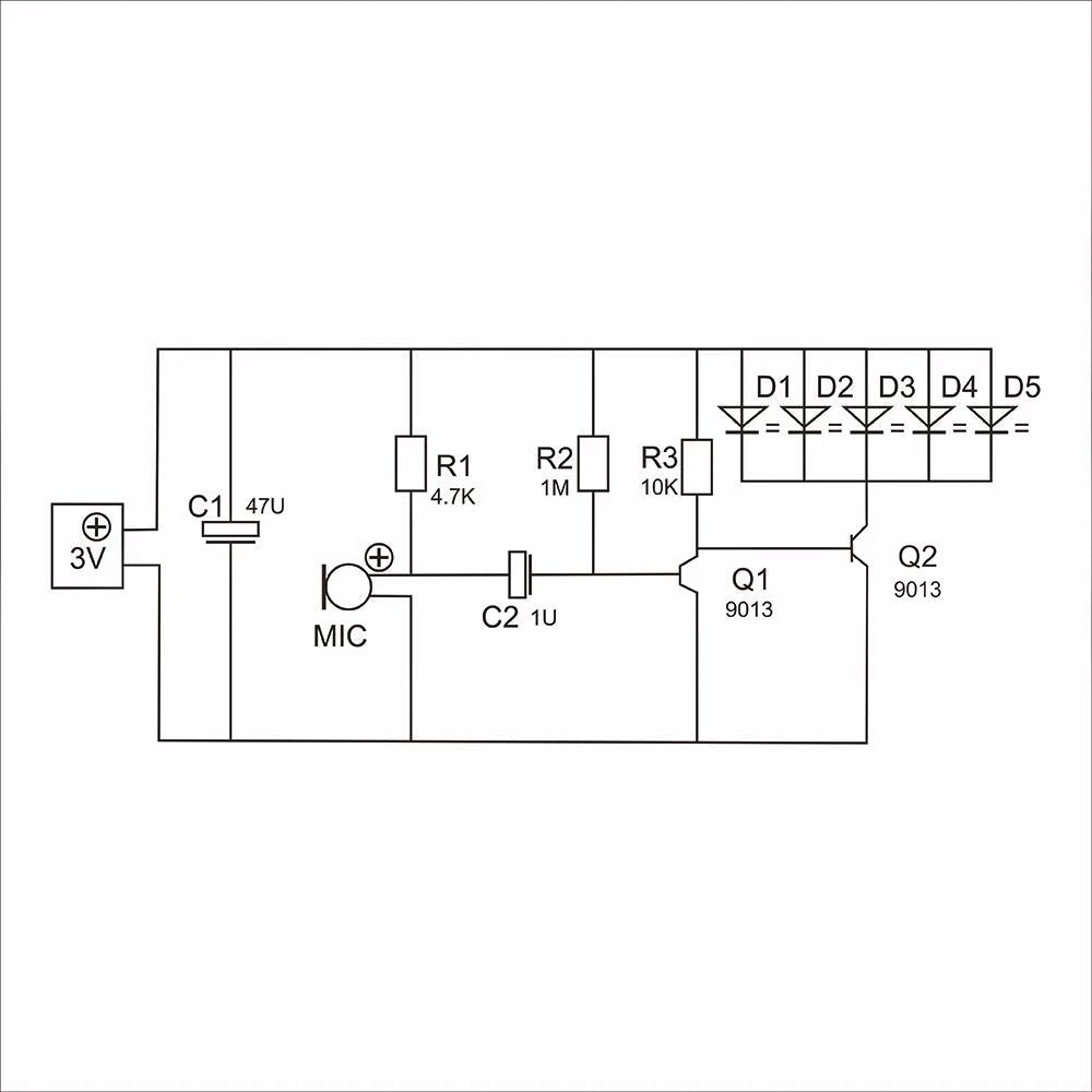 SKD5 melody voice LED lamp is mainly from the power circuit, a microphone amplifier circuit, LED light circuit. Power from the J1 input, C1 filtering supply road use. MK1 the sound signals into electrical signals, coupled to the Q2 C2 the amplified signal to the base of Q1, Q1 driver 5 by the LED light, the greater the sound, LED lights brighter.