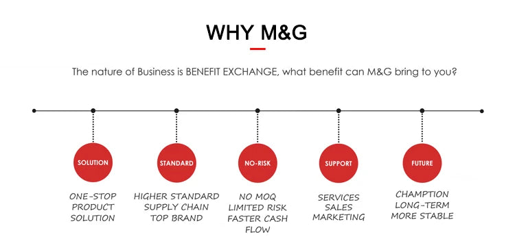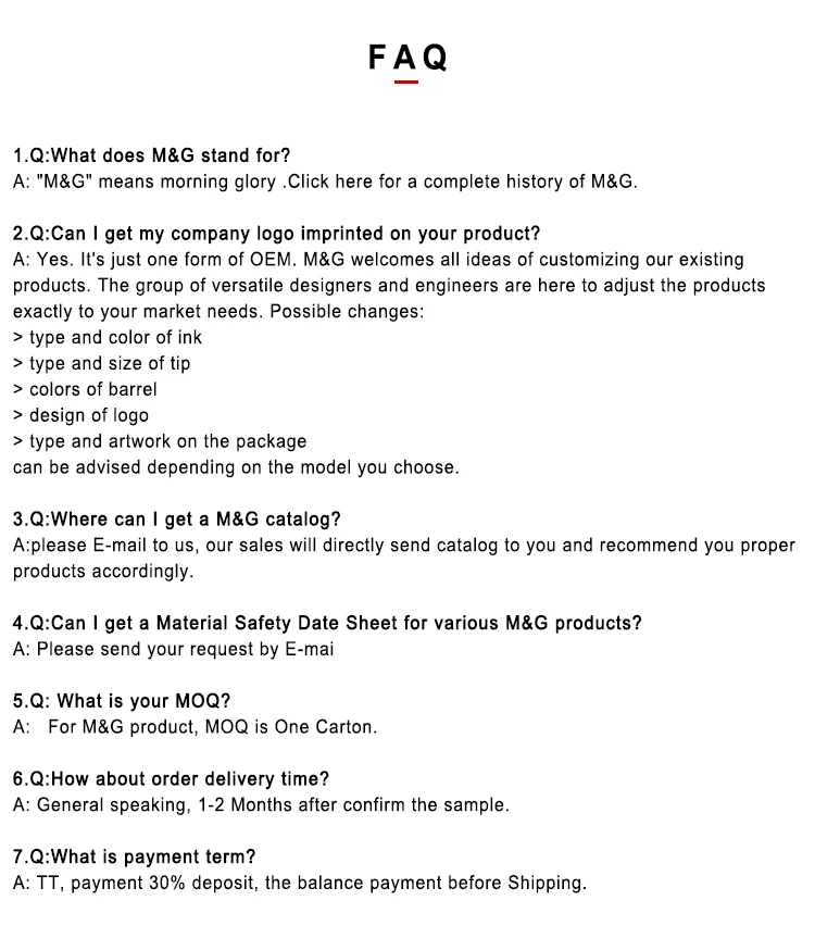 A: Yes. It's just one form of OEM. M&G welcomes all ideas of customizing our existing products. The group of versatile designers and engineers are here to adjust the products exactly to your market needs. Possible changes: > type and color of ink > type and size of tip > colors of barrel > design of logo > type and artwork on the package can be advised depending on the model you choose.